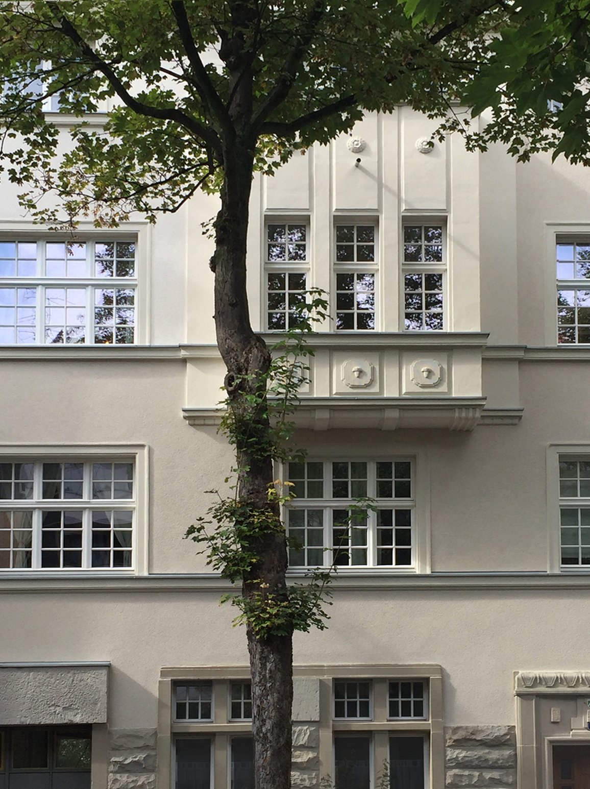 Im Zuge einer Umbaumaßnahme in den achtziger Jahren war ein Fenster im dritten Obergeschoss ohne erkennbare Zusammenhänge positioniert, dieses wurde nun in die Achse der anderen Fenster geschoben – somit ergibt sich eine klare Fassadengestaltung. Alle Fenster wurden mit Sprossen versehen und somit wieder Ihrer ursprünglichen Gestaltung angeglichen.