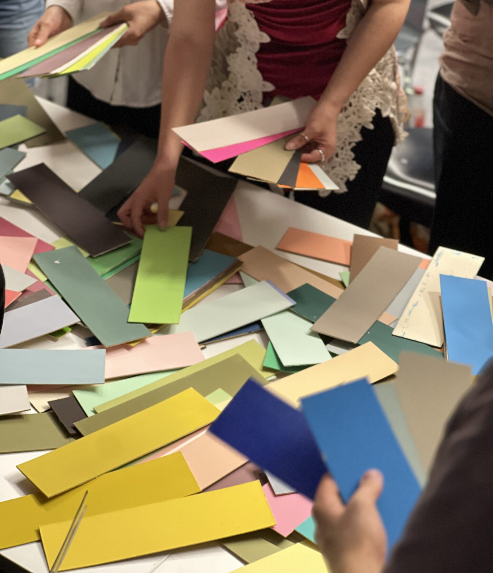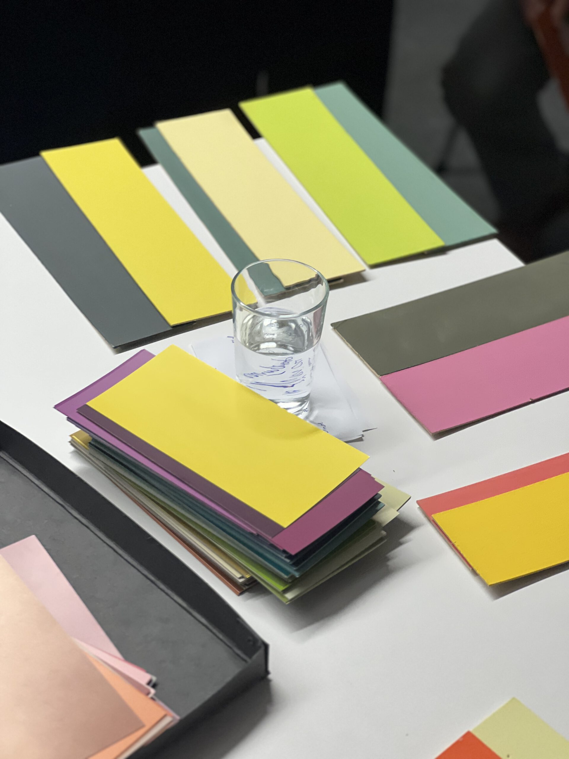 Als ergänzende Übung hatten die Teilnehmenden die Aufgabe, gegensätzlichen Begrifflichkeiten wie „laut und still“ mit handgestrichenen Musterkarten Farben zuzuordnen.