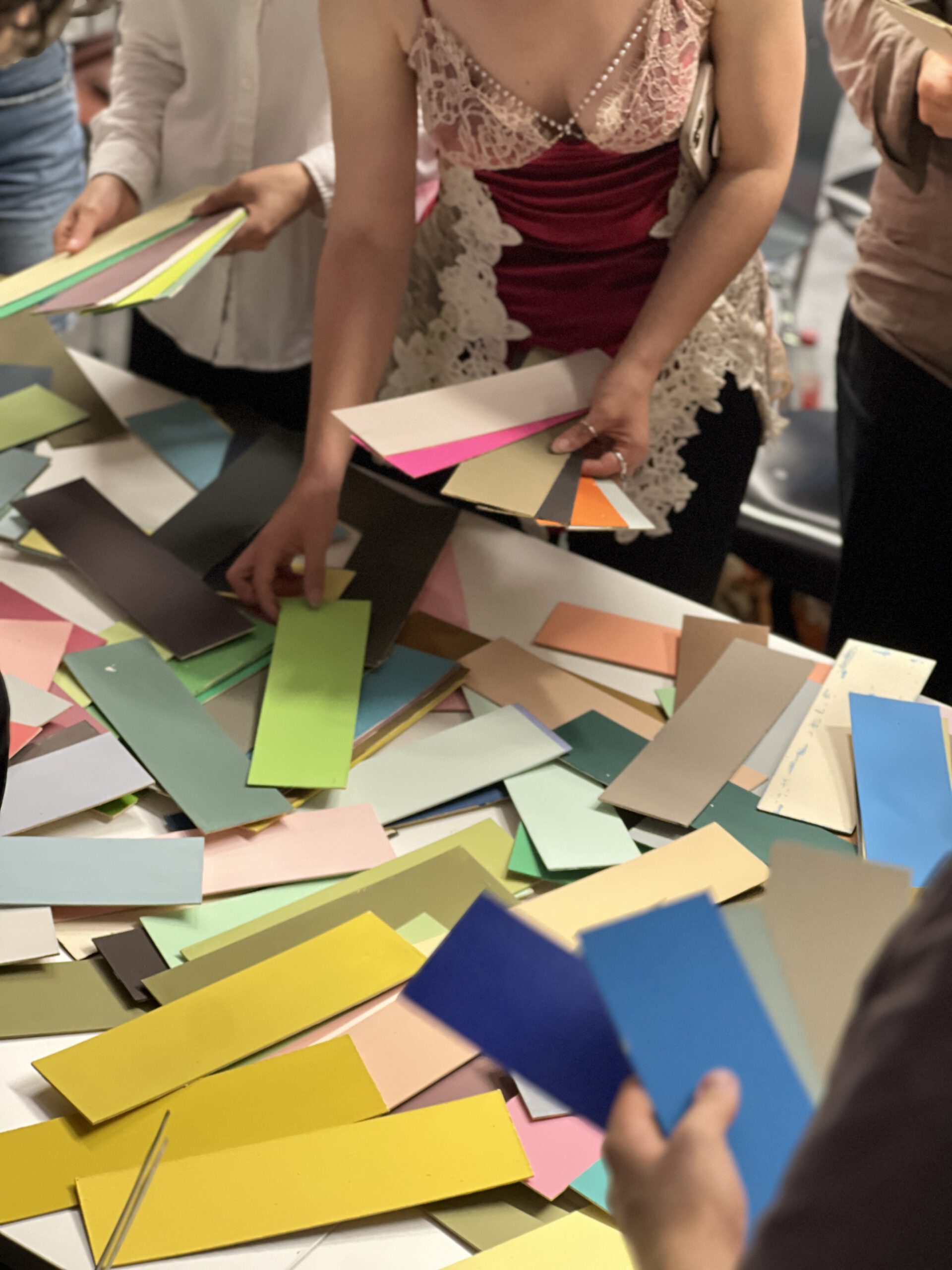 Als ergänzende Übung hatten die Teilnehmenden die Aufgabe, gegensätzlichen Begrifflichkeiten wie „laut und still“ mit handgestrichenen Musterkarten Farben zuzuordnen.